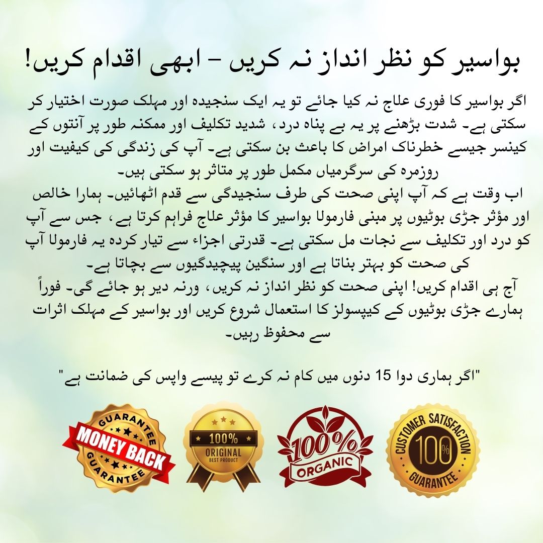 آج ہی اقدام کریں! اپنی صحت کو نظر انداز نہ کریں، ورنہ دیر ہو جائے گی۔ فوراً ہمارے جڑی بوٹیوں کے کیپسولز کا استعمال شروع کریں اور بواسیر کے مہلک اثرات سے محفوظ رہیں۔